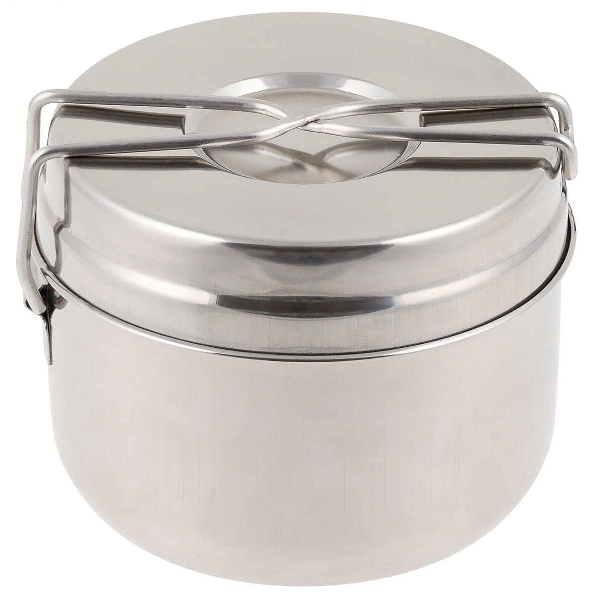 Menażka MFH składa się z 3 części: dwóch garnków i pokrywki, która może służyć również jako patelnia bądź talerz.