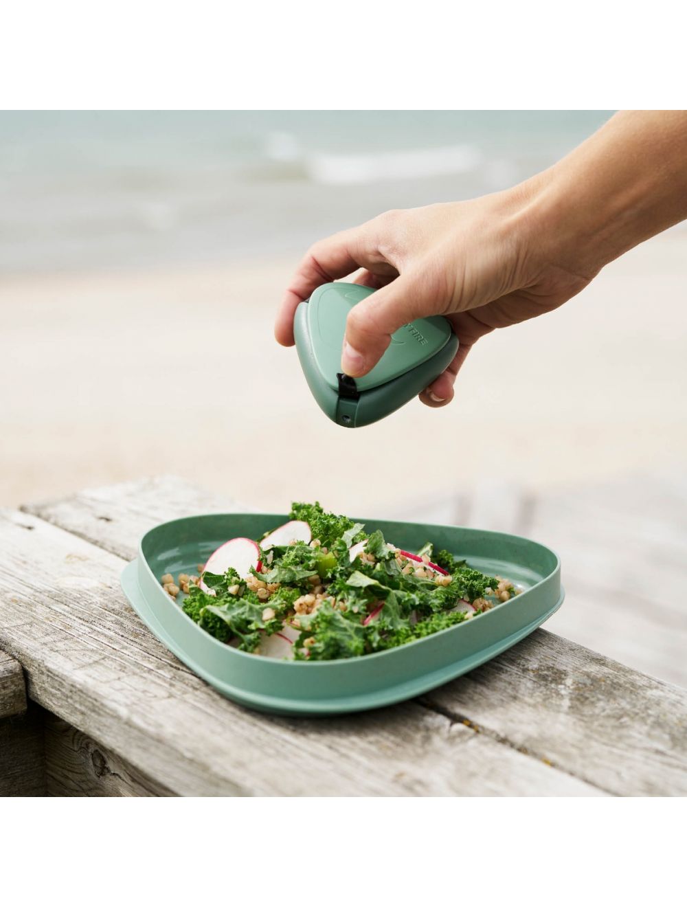 Lekki pojemnik na przyprawy, z trzema rozdzielonymi częściami na trzy różne przyprawy. Otwierane oddzielnie przegródki zamykane są szczelnym gumowym korkiem. Pojemnik nie tonie, utrzymuje aromat przypraw i jest bardzo lekki.
